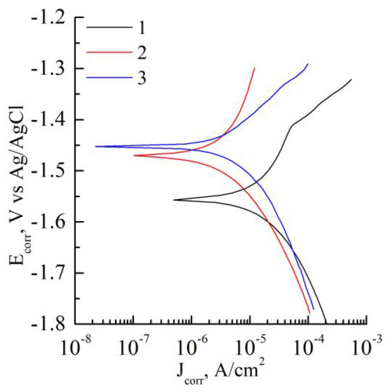 Tafel curves for the Mg–Zn–Zr–Ce alloy after deformation processing: 1—initial, 2—3abc pressing, 3—3abc pressing and rolling.