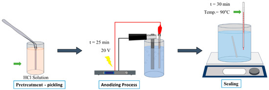 The total time elapsed lasted 25 min with a constant voltage of 20 V at room temperature, where the samples were submerged into the electrolyte using a lead bar as a cathode. The power supply used consisted of a B&k Precision Model XLN30052-GL High Power Programmable DC with a capacity of 300 Volts (V) and 5 Amperes (A). This process was performed for all 6 samples, 2 for each electrolyte. Once the anodization process was completed, sealing in hot water was performed using deionized water for 30 min at 90 ± 2 °C to reduce the porous size.