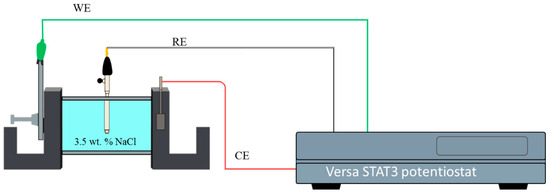 Electrochemical Measurements: Electrochemical noise was conducted at room temperature in accordance with the ASTM G199-09 [35,36] standard using a Versa STAT3 potentiostat/galvanostat/ZRA (Zero Resistance Ammeter) (AMETEK, Oak Ridge, TN, USA) in 3.5 wt.% NaCl solution. A conventional three-electrode cell was used. A symmetric configuration was used with the working electrode (WE) corresponding to the samples, a saturated calomel electrode was used as a reference electrode (RE), and a platinum mesh acted as the counter electrode (CE). Corrosion tests were realized in triplicate. The EN data acquisition rate was studied at 1 data point per second with a total number of points of 1024 (Figure 2).