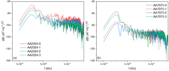 PSD in current for (a) AA2024 and its anodized sample; (b) AA7075 and its anodized sample exposed to NaCl at 3.5%.
