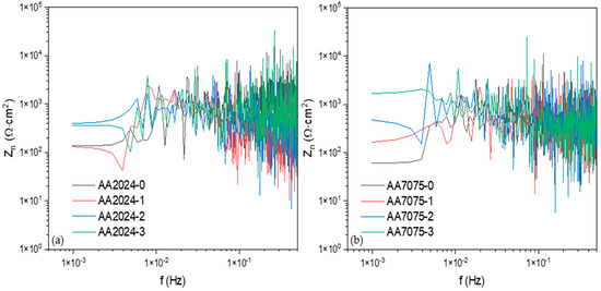 Figure 6 shows the alloys’ noise impedance (Zn) results and their anodized samples when exposed to NaCl. Figure 6a shows the results of the AA2024 samples and their anodized samples. In this graphic, the AA2024-2 and AA2024-3 samples showed bigger values of Zn0, which were 390 and 364 Ω·cm2, respectively (see Table 3), which means that the anodized samples presented better properties against the corrosion of AA2024. Also, the AA2024-1 sample showed low resistance against corrosion.