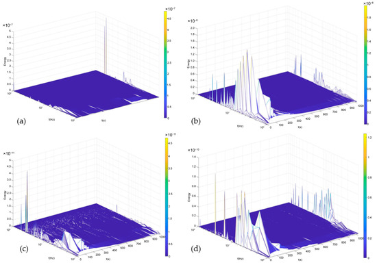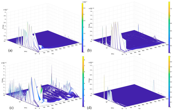 Hilbert spectra for (a) AA2024-0, (b) AA2024-1, (c) AA2024-2, and (d) AA2024-3 exposed to NaCl at 3.5%.