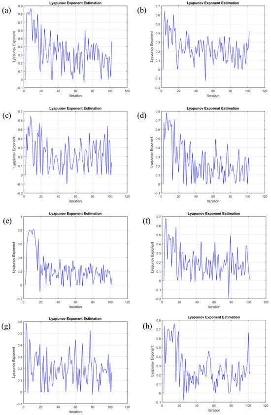 A comprehensive analysis of the Lyapunov exponent was conducted, encompassing 100 distinct iterations. These repetitions were critical in fully understanding the Lyapunov exponent’s behavior in the examined system. Table 4 shows the results of the average Lyapunov exponent value.