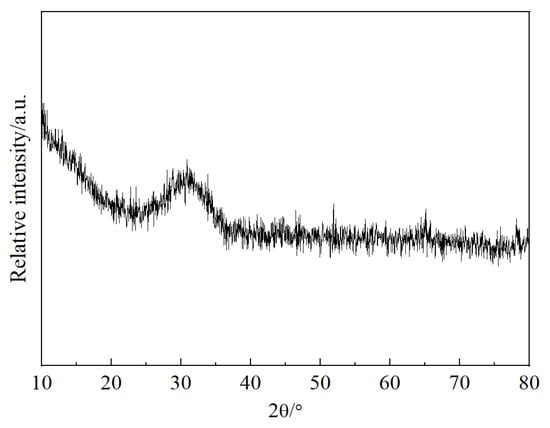 Reagent-grade CaO, SiO2, and FeC2O4∙2H2O powders were utilized to synthesize the samples. When the temperature exceeds 850 °C, FeC2O4·2H2O can decompose into FeO. To investigate the effects of replacing FeO with CaO on slag properties and microstructure, six experimental slags were designed with varying CaO content (5%, 15%, 25%, 35%, 40%, and 50%). The preparation process of quenched slag has been described in our previous research [9]. The quenched slag was subjected to X-ray fluorescence spectroscopy (XRF) and X-ray diffraction (XRD) analysis to determine whether a glassy sample with satisfactory chemical composition was prepared. Table 1 presents the chemical composition of the slag, wherein CaO and SiO2 contents are consistent with the design composition. Some FeO is oxidized to Fe2O3, and the Fe2+/TFe ratio is maintained at around 0.7. Figure 1 shows a typical XRD pattern of the slag. All the XRD profiles only showed a broad peak around the diffraction angle 2θ of 30°, which belongs to the typical glass phase characteristics.