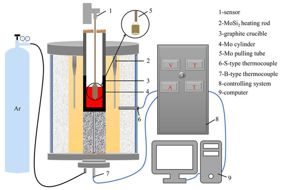 The viscosity and surface tension of CaO-SiO2-FexO slag were measured using the rotating cylinder method and the pulling tube method, respectively. Figure 2 shows the experimental equipment, wherein temperature control is achieved through a microcomputer program with a precision of ±0.5 °C. Surface tension tests were conducted to obtain the average value from six measurements of the surface tension at that temperature. Meanwhile, three viscosity tests were performed, and their average value represented slag viscosity.