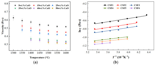 Viscosity–temperature curves of the slags with varying CaO/FexO: (a) different temperatures; (b) linear regression of lnη and T−1.