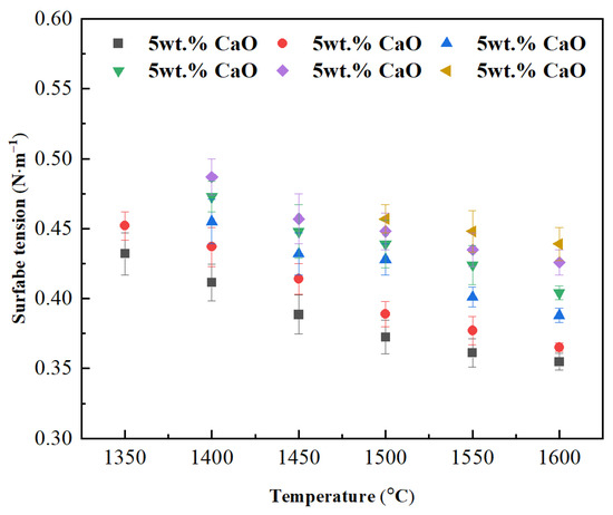 For oxide melts, ions are primarily bound together by electrostatic force, and strong electrostatic forces can lead to significant surface tension. Generally, the electrostatic force is inversely proportional to the distance between ions [22]. Based on this relationship, the reason for the decrease in surface tension of slag with increasing temperature can be explained.