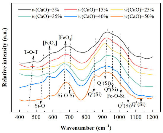 Figure 5 shows the Raman spectra of CaO-SiO2-FexO slag in the frequency range of 400–1200 cm−1. The vibration peaks in the low-frequency region below 500 cm−1 are believed to be associated with the deformation and vibration of tetrahedron [10,11], and no further analysis will be conducted. The intermediate frequency range consists of four vibration peaks near 535, 580, 670, and 710 cm−1. The vibration peaks near 535 and 710 cm−1 correspond to the bending vibrations of Si-O and Si-O-Si bonds [12,13], respectively, while the vibration peaks near 580 and 670 cm−1 represent [FeO6]-octahedra and [FeO4]-tetrahedra [14,15], respectively. As CaO replaces FeO, there is a gradual decrease in relative intensity observed for these vibration peaks at around 580 and 670 cm−1, which is consistent with the decreasing trend of FeO content from 55 wt.% to 10 wt.%.