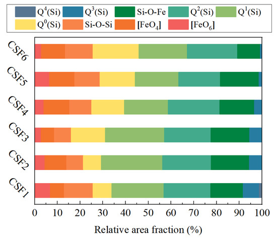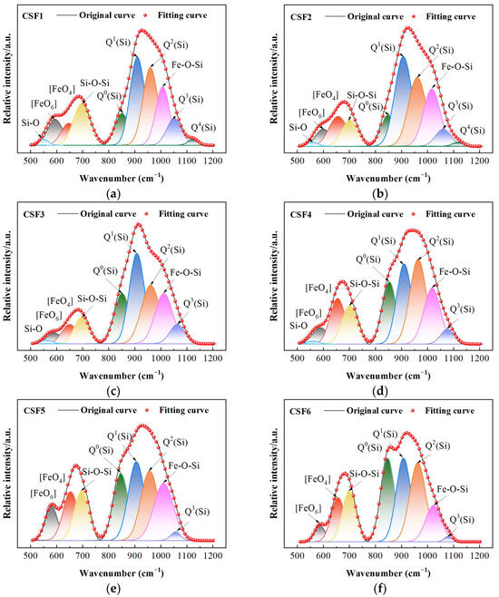 The high-frequency region consists of six characteristic peaks, of which the peaks near 855, 927, 960, 1060, and 1130 cm−1 represent the [SiO4]-tetrahedra with bridging oxygen numbers of 0, 1, 2, 3, and 4 [11,16,17], respectively, and the peak near 1000 cm−1 is related to the vibration of Si-O-Fe bonds [18]. The Raman spectra are deconvoluted according to the above assignments, and the results are shown in Figure 6.