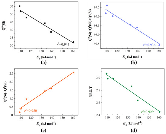 Linear relationship between the activation energy of viscous flow and the structural parameters: (a) Q0(Si); (b) Q0(Si)+Q1(Si)+Q2(Si); (c) Q3(Si)+Q4(Si); (d) NBO/T.