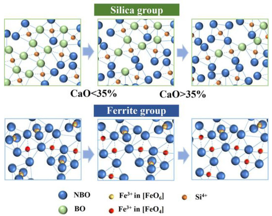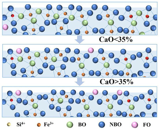 When CaO content exceeds 35%, O2− destroys the Si-O-Si bonds in Q3(Si) and Q2(Si), depolymerizing into simpler Q1(Si) and Q0(Si). Furthermore, an increase in O2− concentration promotes the formation of [FeO4]-tetrahedra by Fe3+, resulting in a reduction in free Fe3+ content [14]. However, the slag remains in a state of dissociation overall. Therefore, the slag viscosity gradually decreases, but the reduction amplitude of viscosity decreases due to the increase of [FeO4]/[FeO6].
