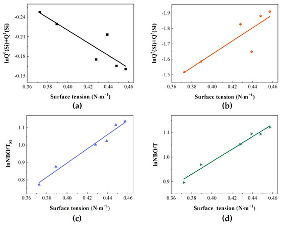 Linear relationship between the surface tension and the structural parameters: (a) Q0(Si)+Q1(Si); (b) Q2(Si)+Q3(Si); (c) NBO/TSi; (d) NBO/T.