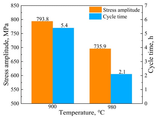 The cycle times (Nf) of the alloy at 900 °C and 980 °C were 3028 and 1287 cycles, which convert to 5.4 h and 2.1 h, respectively. The cyclic stress amplitudes were taken as the average of the stress amplitudes (half the stress range) for cycles Nf/2 − 1, Nf/2 and Nf/2 + 1. Figure 1 shows the cyclic stress amplitude and cycle time of the alloys tested at 900 °C and 980 °C. The cyclic stress amplitude and cycle life of the alloy at 900 °C are significantly higher than that at 980 °C.