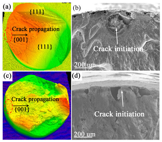Figure 2 shows the initiation and propagation of low-cycle fatigue cracks in the alloy at different temperatures. The crack initiation locations are close to the surface for both temperatures; the crack initiation locations are shown by dashed red boxes and white arrows. At 900 °C, the crack originates at the micropore on the subsurface, shows obvious circular traces around the micropore, and then expands slowly on the {001} plane. After a certain distance, it expands rapidly on multiple {111} planes until fracture. At 980 °C, crack initiation occurs at the surface oxidation and presents a semicircular trace, then spreads slowly on the {001} surface. After spreading a lengthy distance, it transitions into other planes. The areas with the same color in Figure 2a and c indicate the same height, which is the {001} plane. At 900 °C, crack growth occupies a large proportion of the {111} plane, indicating that the dislocation has a weak ability to bypass the γ′ phase at this temperature; the alloy deformation requires the dislocation to cut through the γ′ phase, as shown in Figure 2a,b. At 980 °C, however, crack growth mainly occurs on the {001} plane, indicating that the dislocation mainly moves in the matrix channel and can bypass the γ′ phase. As a result, the cyclic stress at 900 °C is significantly higher than at 980 °C, as shown in Figure 2c,d. At 900 °C, higher cyclic stress can promote the initiation of cracks on the subsurface of the micropore and reach the critical crack length faster than the oxidation crack, which is one of the reasons for the main crack initiating at the subsurface defect.