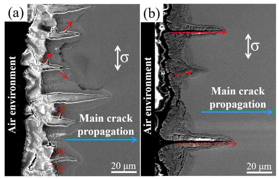 Figure 3 shows the oxidation crack growth of the alloy after low-cycle fatigue at different temperatures. At 900 °C (Figure 3a) and 980 °C (Figure 3b), a certain thickness of oxide layer is generated on the surface of the sample. The oxide layer close to the oxidizing environment has cracks and tends to spall. A portion of the oxide layer grows faster and extends inward in a direction perpendicular to the applied stress axis and consistent with the direction of propagation of the main crack shown in Figure 2. Meanwhile, at 900 °C, the oxidation layer forms microcracks about 45° in the direction of the main crack growth, while at 980 °C the microcrack formation direction is parallel to the main crack growth direction and the microcrack initiation is in the center of the oxidation layer.