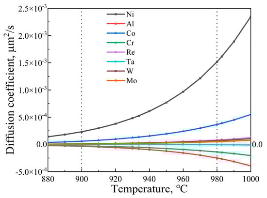 The stratification of the oxide layer is the result of the growth of the oxide layer driven by the charge gradient [29,30,31,32]. The oxidation of alloys at high temperatures proceeds as follows. Oxygen molecules are adsorbed onto the sample surface; Al and Cr formed from oxides with low Gibbs free energy are first oxidized, especially Al with high content. Al2O3 nucleates on the alloy surface and gradually forms a continuous dense Al2O3 layer. Because the diffusion rate of Al3+ in the Al2O3 layer is lower than that of O2−, the growth of the oxide layer mainly depends on the internal diffusion of O2− to react with Al3+ in order to form a fresh Al2O3 oxide layer; thus, the oxide layer of Al gradually grows inward [31,33]. The oxidation process of elements such as Ni and Co is mainly driven by the outward diffusion of metal cations, which diffuse to the oxide layer/air interface and react to form oxides in oxygen. Therefore, the oxide layer of Ni and Co grows outward from the oxide layer of Al and finally forms the outer oxide layer [32]. Heavy metal elements such as Mo are typically distributed near the interface between the inner and outer oxide layers due to their slow outward diffusion. Because Cr is prone to oxidation and has a fast outward diffusion rate, its distribution is broad and usually distributed near the interface between the outer oxide layer and the inner oxide layer. The outward diffusion rate of Ta and Re is slow, usually distributed near the interface; due to the short high-temperature oxidation time, the oxidation layer of Ta and Re is not apparent in the absence of cracks to transport oxygen. At 980 °C (Figure 5), the diffusion ability of O2− is stronger, the formed Al2O3 grows rapidly, and the Al is consumed rapidly, resulting in a less dense inner Al oxide layer with different thickness along with the formation of a γ′-depleted zone [26,34]. Based on the sample composition, the diffusion coefficients of different metallic elements in the alloy were simulated using the Thermo-Calc software (2022.1.95234-411); the results are shown in Figure 6. It can be seen that Al and Cr have significant negative diffusion coefficients, while Ni and Co have significant positive diffusion coefficients. Thus, Al and Cr are the dominant metallic elements in the inner oxide layer, while Ni and Co are the dominant metallic elements in the outer oxide layer. As the temperature increases, the diffusivity of the alloyed elements increases, most significantly for Ni.