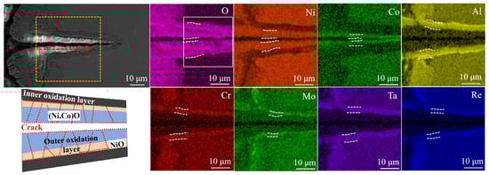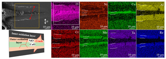 As shown in Figure 8, at 980 °C, an outer oxide layer is formed with Ni and Co as the main metal elements along with an inner oxide layer represented by Al, Cr, and other metal elements. Long cracks appear in the outer oxide layer parallel to the direction of propagation of the main crack, while additional cracks appear in the outer oxide layer and at the interface between the outer and inner oxide layers. At 980 °C the diffusion capacity of O2− is strong, and the increase of diffusion coefficient of Ni is considerably higher than that of Co (as shown in Figure 6). Thus, oxidation of Ni and Co is not significantly different, most of the distribution areas of Ni and Co in the inner oxidation layer coincide, and Ni and Co can form a solid solution. It is widely believed that the oxide layer where Ni and Co exist at the same time is mainly (Ni,Co)O, and includes parts of NiO or CoO [26,33]. The diagram at the lower left corner of Figure 8 shows the oxide layer and crack distribution at 980 °C.