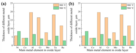 To analyze the cause of the cracks in the oxide layer, the widths of each metal oxide layer shown in Figure 7 and Figure 8 and their fraction in the total oxide layer were statistically analyzed. The statistical range is shown within the white wire frame of the distribution map of O, and the statistical results are shown in Figure 9. At 900 °C, the oxide width and proportion of Al, Cr, Mo, Ta, and Re in the total oxide layer are significantly higher than that at 980 °C. At 980 °C, the width of Ni and Co oxide layers and the proportion of the total oxide layer are higher, especially the Ni oxide layer. It is worth noting that it is difficult to calculate the content of metal oxides in the oxide layer for the following reasons. (1) Unlike the long-term thermal exposure study, the oxidation time in this study was short, making it difficult for all the oxide layers to become dense and uniform metal oxides. (2) With the initiation of microcracks in the oxide layer, the oxidation time from the surface of the sample to the inside of the matrix and the content of metal oxides are different. (3) The oxide layers of various metal elements overlap and are difficult to distinguish accurately. The width of the oxide layer can represent the range of metal oxides, and there is a concentration gradient in the metal oxides content of the oxide layer. In general, the stronger the ability to form metal oxides, the wider the range of the metal oxides distribution; hence, the width of the oxide layer can be used to roughly characterize the metal oxides content. Of course, this can only be used as a simple proof, not as an exact computational basis.