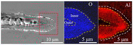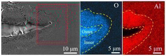 The presence of cracks in the oxide layer and at the inner/outer oxide layer interface significantly affects the crack tip growth rate. Figure 11 shows the EDS map analysis of the alloy fatigue–oxidation crack tip regions at 900 °C. From the distribution of oxygen elements, the enrichment degree of oxygen elements in the outer oxide layer is obviously higher than that in the inner oxide layer. As shown in the distribution of Al elements, there is no Al barren zone.