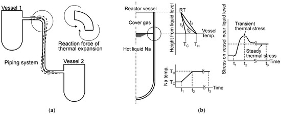 Thermal stress expected during operation in FBR plants [1] permissioned from Japan Society of Materials Science in 2023. (a) Steady thermal stress due to thermal expansion in the piping system. (b) Transient thermal stress due to the temperature gradient in the reactor vessel.