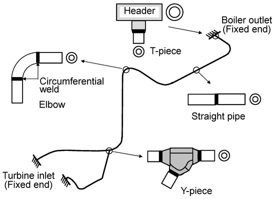 Gr.91 (9Cr-1Mo-V-Nb) steel is an excellent material with high-temperature strength properties and oxidation resistance around 600 °C, so it is widely used in thermal power plants and petrochemical plants. Recently, there have been several reports regarding the creep–fatigue properties of Gr.91 steel or Gr.92 (9Cr-1.8W-0.5Mo-V-Nb) steel [2,3,4,5]. In this paper, a series of creep–fatigue tests of Gr.91 steel were performed at 600 °C to investigate its creep–fatigue properties. Furthermore, the creep–fatigue lives were estimated using the linear damage summation rules of the fatigue damage, the creep damage and the creep–fatigue interaction damage. On the other hand, Gr.91 steel welded joints are key structures for life estimation in thermal power plants. Figure 2 shows an example of the routing and elements in a high-energy piping system [6]. There is a straight pipe, an elbow, a T-piece, a Y-piece and so on, that are connected via circumferential welding. A high-energy piping system is more than 100 m long, and it thermally expands by about 1 m when heated to operating temperatures. However, since it is fixed at the boiler outlet and turbine inlet, the thermal expansion is restrained, and then thermal stress is generated. Therefore, circumferential welded joints are subjected to creep-fatigue loading due to thermal expansion stress and internal pressure during plant operation. Recently, thermal power plants have come to be used as regulated power sources, so creep–fatigue estimation is becoming an important issue as the number of plants starts and stops increases. In this paper, a series of creep–fatigue tests for Gr.91 steel welded joints were also performed at 600 °C to investigate their creep–fatigue properties. The creep–fatigue lives were also estimated using the linear damage summation rules of the fatigue damage and creep damage. Simultaneously, the elastic follow-up phenomena were discussed, where the creep strain in the heat-affected zone (HAZ) of welded joints increases during the strain holding.