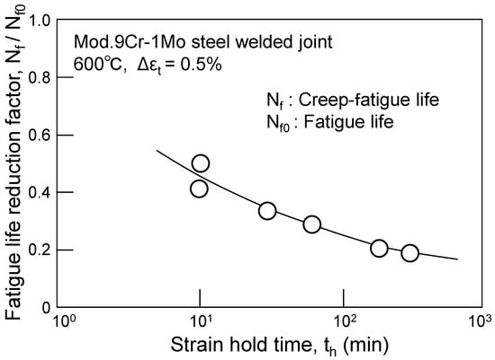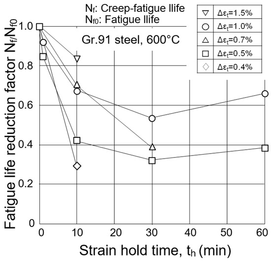 - In a series of creep–fatigue tests of Gr.91 steel at 600 °C, the fatigue life decreased with the tensile strain holding, and the smaller the strain range, the smaller the fatigue life reduction factor. The minimum life reduction factor was approximately 0.3. Furthermore, the longer the strain hold time, the smaller the fatigue life reduction factor, but it tended to saturate at a strain holding of about 30 min.