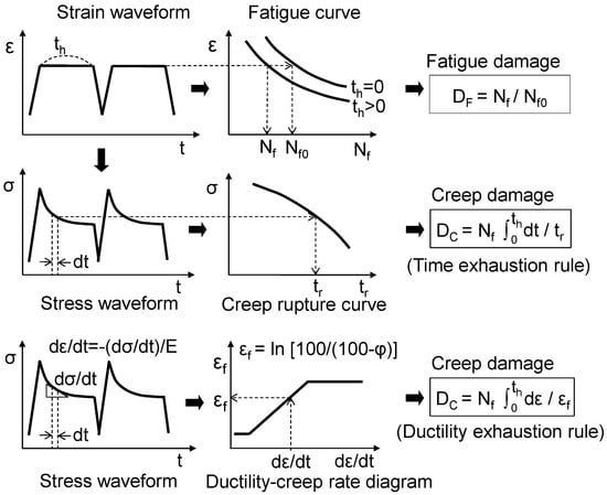 - The creep–fatigue life should be estimated using the linear summation rule of the fatigue damage, the creep damage, and the creep–fatigue interaction damage. In the future, it will be necessary to clarify the creep–fatigue interaction mechanism and define the damage value.