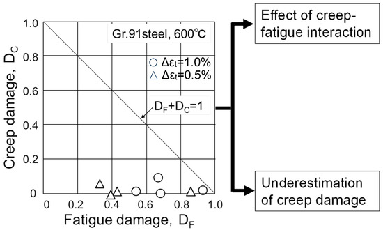 - The test pieces fractured when the linear summation of the accumulated fatigue damage and the creep damage calculated using the time exhaustion rule was much less than 1. One of the reasons is that the creep damage was underestimated, but another important reason is that the effect of the creep–fatigue interaction was not considered. In this material at 600 °C, the damage due to the creep–fatigue interaction is considered to be quite large.