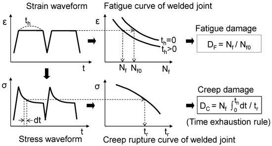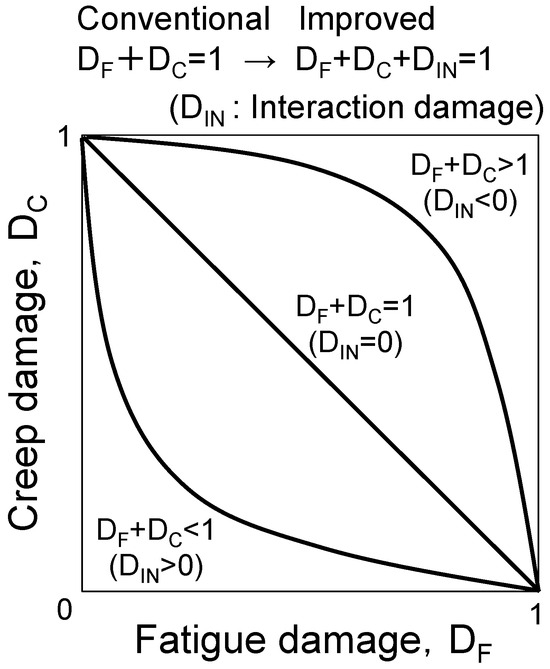 As shown in Figure 9, there are two possible interpretations of the fact that the sum of the fatigue damage and creep damage calculated using the time exhaustion rule was much less than 1 (Figure 8). One is the interpretation that creep damage is underestimated. Many studies [13,14,15] have been conducted on this point, and several countermeasures have been developed. For example, the ductility exhaustion rule adopted by the British high-temperature structural design code R5 [16] is one of them. The second interpretation is that the effects of the creep–fatigue interaction are not considered in the linear damage summation rule. Figure 10 illustrates this schematically. It follows the concept that there is creep–fatigue interaction damage (DIN) in addition to fatigue damage (DF) and creep damage (DC), and failure occurs when the sum of the three damages becomes 1 (DF + DC + DIN = 1). Creep–fatigue interaction damage seems to depend on the material type, temperature range, stress level, and so on. If DIN = 0, then DF + DC = 1; if DIN > 0, then DF + DC < 1; and if DIN < 0, then DF + DC > 1. According to this concept, it is understood that the creep–fatigue interaction damage of Gr.91 steel at 600 °C is very large, and then DF + DC < 1 (Figure 8). Incidentally, as mentioned in Section 2.1, the fatigue life reduction due to strain holding was significant for Alloy 617 (Figure 6), and its cause seemed to be the creep effect during strain holding. In this case, the creep–fatigue interaction damage is very small (DIN = 0), and the sum of the fatigue damage and creep damage is expected to be 1 (DF + DC = 1). Little research has been carried out so far on the mechanism of the creep–fatigue interaction [17,18]. Yokobori et al.’s [19] analysis is one of the few studies. They tried to treat creep–fatigue issues not as an individual combination of creep and fatigue, but as a simultaneous progress of a time-dependent fracture and a cycle-dependent one. Figure 11 shows the procedure for the creep–fatigue interaction analysis. An increased rate of creep–fatigue damage was expressed as a linear summation of the creep crack growth rate and the fatigue one. The term of the fatigue–crack growth was multiplied by a time-dependent coefficient, and similarly, that of the creep–crack growth was multiplied by a cycle-dependent coefficient. If coefficient α does not depend on time t, and coefficient β does not depend on cycle N, there is no creep–fatigue interaction (DF + DC = 1). Regarding the creep–fatigue life estimation, it seems that clarification of the creep–fatigue interaction mechanism and how to define the creep–fatigue interaction damage remain issues for the future.
