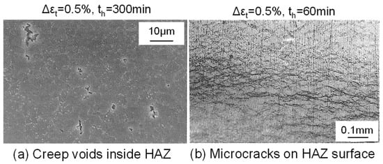 - Kubo, K.; Kanemaru, O.; Yagi, K. Relationship between ceep damage mode and creep-fatigue interaction for SUS 321 steel. J. Soc. Mater. Sci. Jpn. 1993, 42, 1–7. [Google Scholar] [CrossRef][Green Version]