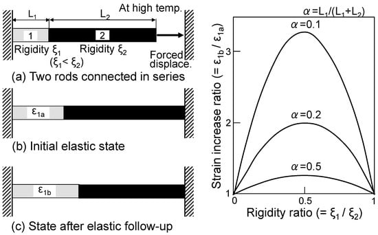 One of the reasons why the life estimation results based on the linear damage summation rule were much less than 1 (Figure 19) is that the elastic follow-up phenomena peculiar to welded joints were not considered [2]. Figure 20 shows the concept of the elastic follow-up phenomena [22]. Rod 1, with low rigidity ξ1, and rod 2, with high rigidity ξ2, are connected in a series. When a forced displacement is applied to the connected rod at high temperatures, assuming that only rod 1 creeps, the elastic deformation of rod 2 is transferred to rod 1 with the stress relaxation of rod 1. As a result, the creep strain of rod 1 at the initial state ε1a increases to the strain after the elastic follow-up ε1b. The strain increase ratio ε1b/ε1a is determined by the rigidity ratio ξ1/ξ2 and the ratio of the length of rod 1 to the total length α (=L1/(L1 + L2)). For example, the value of ε1b/ε1a exceeds 3.0 when the value of ξ1/ξ2 is 0.5 and the value of α is 0.1.