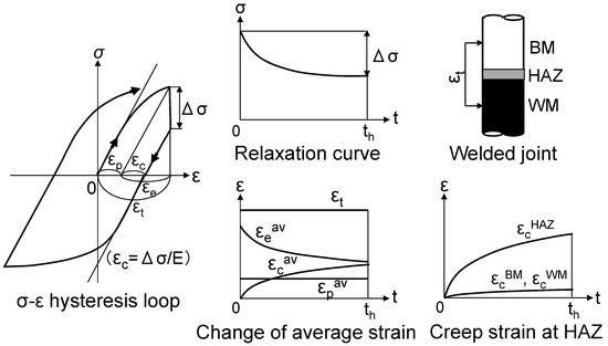 In Gr.91 steel welded joints, the base metal, the HAZ and the weld metal are connected in a series (Figure 12), and the rigidity of the HAZ may be much lower than that of the base and weld metals. Furthermore, the value of α may be approximately 0.1 (=2 mm/25 mm). Therefore, the creep strain of the HAZ may increase due to the transfer of the elastic strain from the base and weld metals according to the elastic follow-up phenomena during the strain holding. Figure 21 illustrates this schematically. When the total strain εt is kept constant, the average plastic strain εpav does not change, although the elastic average strain εeav decreases and the average creep strain εcav increases with the stress relaxation. Here, the average creep strain εcav is the average among the creep strain of the base metal εcBM, that of the weld metal εcWM and that of the HAZ εcHAZ. While the creep strains of the base and weld metals hardly increase, the creep strain of the HAZ seems to increase significantly. In the future, it will be important to quantitatively evaluate the effects of the elastic follow-up phenomena in the creep–fatigue life estimation of welded joints.