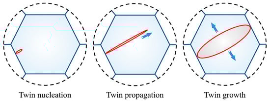 To date, the mechanical performance and microstructural evolution of Mg alloys deformed at different strain rates have been extensively studied [14,15,16]. For example, Lin et al. [17] conducted a systematic study to investigate the effect of strain rate on the yield strength, ultimate tensile strength, and ductility of the extruded AZ31B Mg alloys. They found that the ultimate tensile strength and yield strength of the alloy increase with the strain rate, whereas the tensile ductility exhibits the opposite trend. Previous reports suggested that the dependence of mechanical properties and microstructure evolution on strain rate is associated with several parameters, such as deformation temperature, grain size and texture [18]. Texture plays a significant role in the variation of plastic deformation behavior with strain rate. Tucker et al. [19] reported that the yield strength of AZ31 Mg alloys is highly affected by strain rate during compression along the normal direction (ND) of the plate, whereas it exhibited no strain rate dependence during compression along the transverse direction (TD) and rolling direction (RD). Hence, the strain rate sensitivity shows a substantial anisotropy in Mg alloys. The anisotropic strain rate sensitivity is strongly related to the activated deformation modes in certain conditions. Generally, Mg alloys show more significant strain rate sensitivity when the deformation is dominated by dislocation slip. A quantitative relationship between the activated deformation mode and mechanical properties is critical to understand the plastic deformation behavior of Mg alloys. Wang et al. [14] quantitatively studied the microstructure evolution during deformation at strain rates of 0.001, 1 and 600 s−1 in an AZ31 Mg alloy. They reported that the dislocation density of samples deformed at a strain rate of 600 s−1 is much higher than of samples deformed at a lower strain rate, while the {102} twin fraction increases remarkably with the strain rate, and is saturated when the strain rate is up to 1 s−1. It is generally considered that the twinning process is characterized by twin nucleation, propagation and growth [20,21], as schematically shown in Figure 1. However, how the strain rate affects the twinning process is not yet clear. In addition, the critical resolved shear stress (CRSS) for twin nucleation and propagation is higher than that for twin growth, leading to the formation of a Lüders-like plateau in the stress-strain curves in some finer-grained samples. Given that strain rate has an important effect on twin activity, it would also affect the Lüders-like plateau. However, how strain rate affects the yield plateau also remains unclear.