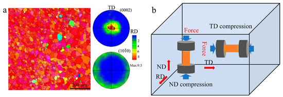 (a) Crystal orientation map of AZ31 plate and corresponding pole figure, (b) a schematic diagram showing the loading direction.