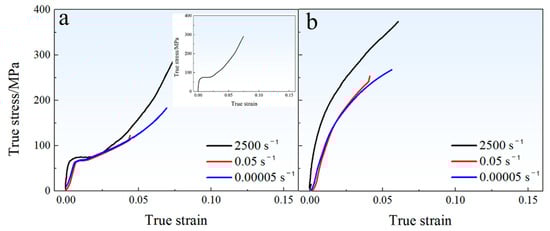 Magnesium (Mg) alloy has a lower density compared to steel and aluminum alloys, making it a promising material for replacing them in the automotive and aerospace industries [1,2,3,4]. Components in these industries often experience loading over a wide range of strain rates [5,6]. For instance, high-strain rate deformation occurs during automobile crashes or impacts [7,8]. Additionally, certain plastic forming technologies, such as explosive forming and electromagnetic forming, could exceed 103 s−1 in terms of strain rate [9,10,11,12]. Therefore, it is paramount to understand the plastic deformation behavior of Mg alloys at different strain rates [13].