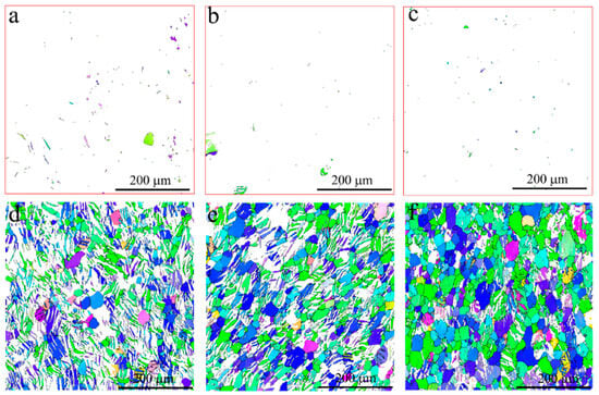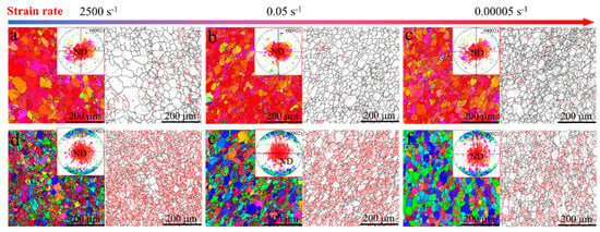 Crystal orientation map of twinned region, (a–c): under ND compression at strain rate of 2500 s−1, 0.05 s−1, and 0.00005 s−1, respectively, (d–f) under TD compression at strain rate of 2500 s−1, 0.05 s−1, and 0.00005 s−1.