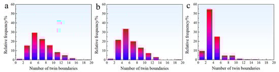 Frequency of twin boundaries in each grain under compression along TD: (a–c) at strain rate of 2500 s−1, 0.05 s−1, and 0.00005 s−1.