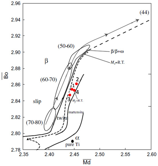 | Alloys Ident. | Alloys (% Mass) | Ti | Nb | Mo | Zr | Bo | Md | [Moeq]% [20] | [Moeq]% [21] | e/a |