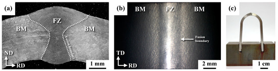 Macroscopic photos of (a) the U-bend weld in a cross-sectional view, (b) the top appearance of the U-bend weld, and (c) a lateral view of the U-bend sample for the salt spray (BM: base metal; FZ: fusion zone).