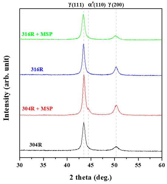 The annealed 304L and 316L plates were non-ferromagnetic, i.e., the ferrite number (FN) determined according to the ferrite scope was nearly zero. The cold rolling of unstable ASSs was expected to cause strain hardening and strain-induced martensitic transformation. With a 10% reduction in thickness after cold rolling, a minor increase in FN from 0 to 0.7 was found for the 304R and about 0.1 for the 316R samples. The XRD spectrums of the cold-rolled plates in the as-rolled and shot-peened conditions are shown in Figure 2. The XRD results indicated that no distinguishable ferrite phase was observed in the 304R and 316R samples. After peening, a slightly broadened γ peak was seen in the 304RSP sample, which could be related to the formation of a certain amount of α′-martensite mixed with the γ matrix. In contrast, γ was still the predominant phase in the 316RSP sample. The ferrite scope and XRD spectrum confirmed that 316L SS had high resistance to strain-induced transformation relative to that of 304L SS. It is reported that plastic deformation induced by MSP assisted austenite in martensite transformation and strain hardening within a narrow depth [34]. The microstructure of the cold-rolled ASSs showed traces of slip lines within the granular austenite matrix, especially around the external surface, which were not seen in the annealed plates and would be confirmed in the following EBSD analysis. As reported previously [31], the FZ of the 304L and 316L welds had a FN of about 1.78 and 0.54, respectively. The high FN of the 304L FZ was associated with the skeletal microstructure with vermicular ferrite (δ) within the solidified matrix. In contrast, cellular dendrites with less ferrite are formed in the 316L FZ of low FN [31].