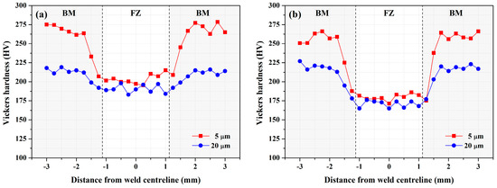 The micro-hardness profiles in distinct zones of two welds are displayed in Figure 3. The micro-hardnesses were determined from one side of the BM across the FZ to the other side of the BM. As shown in Figure 3, each hardness measurement was performed at 5 and 20 μm from the outer surface of the cold-rolled plates in the as-welded condition. Cold rolling resulted in slight strain hardening around the surface of the SS plate. The peak hardness in the cold-rolled plate decreased from about HV 275 to HV 225, increasing the depth from 5 to 20 μm from the outmost surface. Because of the imposed strain-hardening of the cold-rolled plate, the hardness of the FZ was the lowest among the distinct zones in the weld, regardless of the welds (Figure 3). At a depth of 20 μm away from the top surface of the plate, the difference in hardness between the FZ and the BM of the two welds became less.