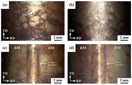 The surface appearances of distinct samples after salt spraying are illustrated in Figure 5. Compared with the annealed plate [31], severe rusting in different patches with deep pits was seen in the 304R after salt spraying (Figure 5a). However, rusting in 16R after the test was moderate (Figure 5b) compared to that in 304R. Thus, cold rolling inevitably decreased the corrosion resistance of the ASS in a salt spray. The top appearance of the U-bend welds is shown in Figure 5c,d. The 304RW (Figure 5c) sample rusted more heavily than did the 316RW sample (Figure 5d). The FBs of the weld were corroded more severely than were the other zones of the weld. The discontinuous profile at the FB might assist the accumulation of harmful species therein, resulting in heavy rusting. Moreover, the imposed welding heat on the cold-rolled SS plate would enhance the occurrence of sensitization in the HAZ of an ASS weld [15,16]. Overall, the macro-appearance of the U-bend samples after salt spraying was similar in each group with or without shot peening. However, the corrosion pits and fine ditches were less likely to form in the 316RWSP sample.