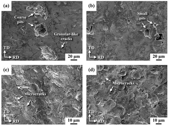 SEM micrographs displaying the surface morphology of the U-bend test pieces after salt spraying are shown in Figure 6. The 304R sample corroded severely, and showed granular-like cracks inter-dispersed with coarse pits (Figure 6a). In contrast, no granular-like cracks and small corrosion pits were seen in the 316R sample after salt spraying (Figure 6b). After MSP, the corroded surface of the 304RSP sample showed uneven dent sizes inter-dispersed with numerous microcracks (Figure 6c). In contrast, less rusty dents with sparse microcracks were observed in the 316RSP sample (Figure 6d). It was obvious that MSP was able to prevent the formation of coarse corrosion pits in the cold-rolled ASS.