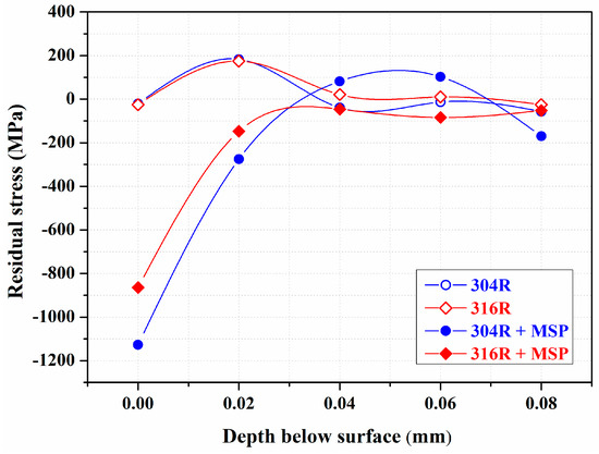 Residual stress profiles along the thickness direction from the top to the interior of the 304R and 316R samples with or without MSP are shown in Figure 8. In prior work [31], residual stress profiles of the as-welded FZs along the thickness direction were determined after grinding off the weld reinforcement. Peak tensile stress lower than 150 MPa was present in the as-welded FZs, possibly due to the low heat input of laser welding [31]. The tensile stress state of the as-welded FZ changed into a compressive state of about 750 MPa after MSP [31]. It was expected that residual tensile stress would increase the SCC susceptibility of the investigated sample, whereas residual compressive stress would mitigate the occurrence of SCC. As shown in Figure 8, the residual stress profiles of the 304R and 316R samples were similar. The residual stress was in tension on the subsurface of the 304R and 316R samples, and the peak stress was about 200 MPa in tension. Residual tensile stress on the 304R and 316R samples was expected to increase their SCC susceptibility. However, a residual compressive stress of over −800 MPa was obtained for the peened 316R sample (316R + MSP) and that of −1100 MPa was obainted for the peened 304R sample (304R + MSP). Such high induced residual compressive stress after MSP could be related to the shot peening of the cold-rolled plate and the induced martensitic transformation in the peened zone. As shown in Figure 8, the narrow compressive stress field could be associated with the intense but limited depth of plastic deformation caused by MSP. In this work, the discontinuous profile made the stress measurements around the FZ impractical. However, introducing residual compressive stress via peening the weld was anticipated to lower the SCC susceptibility in different zones of the ASS weld.