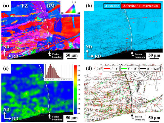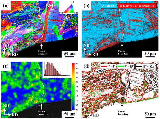 EBSD (a) IPF map, (b) phase map, (c) strain map, and (d) GB map of the U-bend sample around the FZ of the 304RWSP sample in a cross-sectional view.