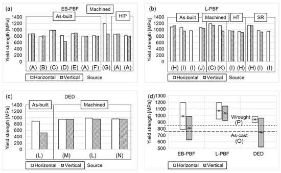Influence of the manufacturing process, material condition, and testing direction on the yield strength of Ti6Al4V from different literature sources for (a) EB-PBF, (b) L-PBF, (c) DED, and (d) summary of the range of yield strength values depending on the manufacturing process. The reference values of yield strength for as-cast (long-dashed line) and wrought condition (short-dashed line) are provided as well. Data from Ref. (A) = [], (B) = [], (C) = [], (D) = [], (E) = [], (F) = [], (G) = [], (H) = [], (I) = [], (J) = [], (K) = [], (L) = [], (M) = [], (N) = [], (O) = [], (P) = [].