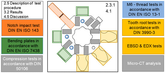 Following DIN EN ISO 7438 [], bending specimens are arranged on the base diameter. Materials that have good formability will not fail. In addition to the force–displacement relationship, springback can also be investigated here. The last two placeholders in the 45° direction are designed in accordance with DIN EN ISO 148-1 [] with a notched bar impact test specimen or a feather key according to DIN EN 6885 [].