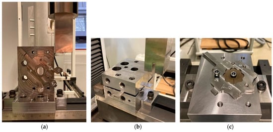 To carry out the various tests, a mounting and fixing tool for a universal testing machine was set up. Figure 3 depicts the tool mounted in the testing machine (Figure 3a), the tool mounting plate in the testing machine (Figure 3b), and the test specimen mounted in the fixation tool (Figure 3c).