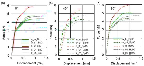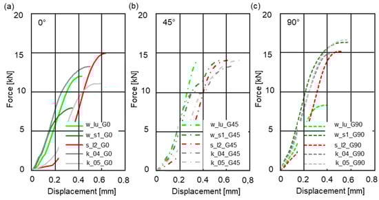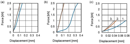 The test series was started with the tooth root bending tests in 0° orientation and the contact stiffnesses were balanced by preloads in the elastic load range. The load and termination parameters for the three tests are shown in Table 3. Figure 5 shows as an example the pre-load force–displacement curves for the samples k_04 for the tooth root (Figure 5a), the bending plate (Figure 5b), and the thread test (Figure 5c). It can be seen that from the third load onwards almost no changes in the force–displacement curve were to be expected and the test could be started. Equalisation of the stiffnesses had to be carried out after the fixture had been modified and each specimen changed. Internal specimens could only be taken after these tests have been carried out. The compression-test specimens could be used for CT scanning before their actual test.