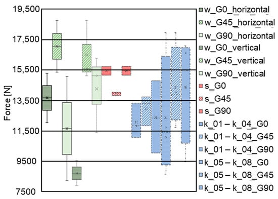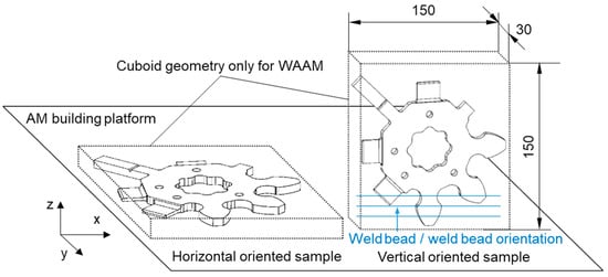 In this section, the manufacturing parameters of the different manufacturing routes are presented. The reference component was milled from rolled sheets with a CNC milling machine VF-2SS, Haas. For both additive manufacturing processes, the position of the part in the build space had a significant influence. The horizontal position, i.e., parallel to the building platform, and the vertical position in the direction of assembly were examined (see Figure 6). Other possible directions, such as 45° rotated or tilted, were not considered. Due to the direction-dependent design of the test specimen, the influence of anisotropy on the conventionally manufactured reference component could be visualised very easily. The same parameters and tools were used for milling. The dimensional tolerances were within the range of ±0.05 mm. As the testing parts always had the same geometry and used identical milling parameters, the mechanical behaviour due to the same geometrical tolerances and surface conditions was considered to be comparable among all examined processes.